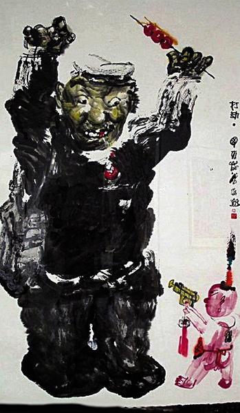 王炎林 《打劫》 2007年 ○ 阿莹 一定会有人记得那一副英俊的脸颊,一双浓眉大眼配以浓密的胡子,掩盖着他那火焰般的思维,一旦提笔蘸墨,乖戾与幽默便伴随着心底的嘲笑直面人世了。 似乎王炎林离开我们仅仅几年的时间,社会上便很少听到他那急促又激昂的声音了,唯有的欣慰是陕西美协前些年出版了一部《长安精神》,收录了画家零星的作品,引起了人们对一位优秀探索家的追思,也对王炎林为何在长安画派的诞生地进行了这么一番创新多有叩问。所以,对这样一个画家做以研究是有意义的。 应该说王炎林是一位特立独行的人,是上世纪那个狂飙突进时代的产物。以前他是学油画的,经历了“文革”的风雨洗礼,又在思想解放的大潮中接触了纷繁庞杂的西方思潮,所以他后来用油画的涂抹开始了中国画的探索,今天看来这个探索层次还是很高的。画家打破了中国画的传统程式,想用个性笔墨吼出心底的呼声,其用笔之犀利,用情之深刻,都是前所未有的。若站在他绘制的画作前,如果没有画家的解析,你直感天地混沌了,人鬼混淆了,给人以强烈的视觉冲击,好像进入了一个魑魅乱舞的世界,让人感到窒息,感到不知所措,于是惊恐、迷惘、丑陋、卑劣、忏悔……也就伴随着一声声高亢的呐喊炸响开来,任何人去阅读都禁不住要思索再三,画家究竟想表现什么呢? 王炎林在上世纪末创作的《大旋风》,大概就是画家当年思维的概括,团团墨迹叠压的画幅上,隐约有三四个小人颠三倒四地围绕着一个惊恐的脸庞在旋转,似乎世间人物都被裹挟起来,地球也随之飞跃起来了,中间一双惊恐的眼睛流露出刻骨铭心的迷惘和恐惧,好像世界末日来临了。还有那幅《红飞机》,只见半截机身从天而降,似有孩子戴着项圈长命锁从飞机里弹出来,一个黑乎乎的人影惊诧地撑地欲起,另一人手捂耳朵更欲跑开。这幅作品是不是暗喻人们随时都有危险从天而落,就像头顶时刻悬着达摩克利斯之剑?应该说画家的喻意一定是多层次的,也就是要制造出这样一种感觉来,让人们对作品的认识产生歧见,也好就此引发高高低低的议论。 显然,王炎林这种狂飙突进般的画法,带有强烈的西方现代美术的痕迹,尽管赢得了一些业内人士的喝彩,但是在传统文化浓厚的土地上很难登堂入室,让老百姓跃跃欲试,可能主动找他商谈画价的商贾比那些叱咤市场风云的弄潮儿少多了。于是有朋友建议他改变这种几近恐怖的形象,朝世俗靠近一些,创作一些老百姓能接受的作品,试想谁敢把那张牙舞爪的怪诞模样挂在堂屋里呀。所以,进入新世纪以后,王炎林的画风有了明显的转变,改变了那种疾风骤雨式的末日般的创作,转向了民众可以认知的形状,主题也开始向世俗转移,阳光和温柔在画家笔下渐渐多了起来。 一方面他将幽默的思考带入画作,使得那些夸张而又荒诞的人物变得可爱起来。当然王炎林的幽默往往是冷涩的。画家为了引起读者注视,喜欢用童趣般的天真来表达深邃的思想。比如那幅《海啸有什么不好》,画面上三个可能经历过海啸风暴的男人,惊奇地盯着地上一只美人鱼露出滑稽的表情。我想画家似将这种劫后余生的苦楚与意外的收获纳入尺幅,让不同的人阅读产生不同的解读。还有那幅《时代画报·你猜》,一个青春女子突然双手蒙住了正在指挥交通的警察,从女子飘起的挎包可以知道这个女子是突然扑上去的,从女子已经笑得看不见眼眉,可以知道两个人是熟悉的,已经熟悉到可以不顾警察职业的神圣来不顾一切地表达他们甜蜜了。画家为解读这个画面,还特意注明“时代画报”,就是说这可能是报刊上的一则消息,而“你猜”两个字又把幽默推向了极致。谁能不想这也可能是个狂妄女子的恶作剧呢?画家就这样将神圣与轻佻和谐地组合到画面上,你不能不感叹作者才情卓然矣。 那幅《打劫》画得更有趣味了,一个三四岁的小男孩手持一把玩具手枪瞄准高大的男人大喊“打劫”,从小孩怒发冲冠的辫子和满身的红色,可以知道小孩是认真的,而那个大男人双手高高举起,眼球斜视的投降状,也是佯装害怕,但他手里那一串糖葫芦,说明大人是在配合小孩做游戏。这种带有童趣的幽默不由得使人哑然失笑,感觉画家对生活的观察真是入木三分,背后则是满满的甜蜜弥漫开来。 另一方面王炎林将民俗带进了画面,表现了老百姓经历了改革开放逐渐富裕的情形。那幅《哈啰》,画的是中国人熟悉的孙悟空、猪八戒和唐僧,三个相依为命的僧侣,手持法器展现了慈祥与和善,这大概是民间闹社火的一个场景,抓住了老百姓丰收的满足。那幅《垄亩丰盈年景好》,大概是小镇街头的一个情景,一个戴墨镜的男人带一孩童从一个卖玩具的女贩边经过,小孩手中的小鸟杂耍展示着喜悦,而背着孩子的女人与地上的小狗和空中的雀儿更增添了赶集的乐趣。还有那《春满长安》,尤将富裕起来的百姓在集市上的情形,用独有的笔墨刻画出来,有母子相牵,有孩童顽笑,有宝鸡泥塑,有老牛披红,有玩具灯笼,一派喜气洋洋的情形,正如画家题款:春色满园。我们通过阅读王炎林的这些创作,可以明显感觉画家对社会的认识和看法已经悄然发生了变化,已不似以前那样愤世嫉俗了,开始用温和的眼光观察世界感受生活了。 尤其能代表画家思想变化的是,王炎林在进入新世纪后陆续画了一批以女人裸体为对象的画作。这些女人不管是含情脉脉