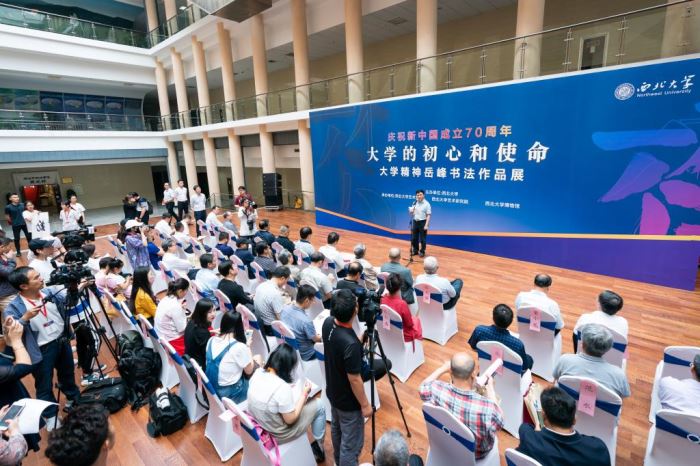 6月22日上午,西北大学“庆祝新中国成立70周年 大学的初心和使命——大学精神岳峰书法作品展”在该校博物馆举办。