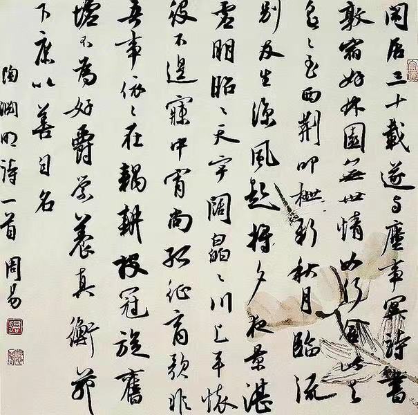 看书家周易娴熟、优雅地在宣纸上沙沙地纵情书写,笔走龙蛇,似鸟栖闲枝,若鱼跃莲池,我曾数度惊诧,沉醉。原本单调、干瘦,甚至颇为僵直的那些点与线,在周易的自如挥运下,被演绎得洒脱秀逸,淋漓尽致,倏然富有了意趣和灵性,不能不说是种美妙绝伦的心理愉悦与精神享受。