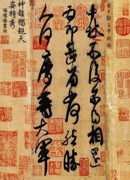 《中秋帖》为晋代王献之所书,纵27cm,横11.9cm。是著名的古代书法作品,与王羲之的《快雪时晴帖》、王珣的《伯远帖》合称“三希”,意即稀世珍宝,原为五行32字,后被割去二行,现仅存三行22字。