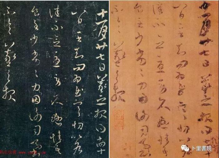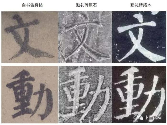 二、继续临摹孔子庙堂碑 1、刻本临写时要还原汉字的本象,即在自然书写的前提下,还原书写性,要借鉴墨迹本,如智永真草千字文、文赋、祭侄稿、自书告身帖、四十三行灵飞经等; 2、今天我们看到的刻本,是自然因素和人为因素共同作用的结果,自然因素如风化侵蚀,人为因素有大量捶拓、拓工水平、剪裱、人为破坏、印刷等; 3、印刷对字帖的影响和作用是相当大的,即使是墨迹本,也会有大量信息损失,所以,有条件的要多看真迹原作。