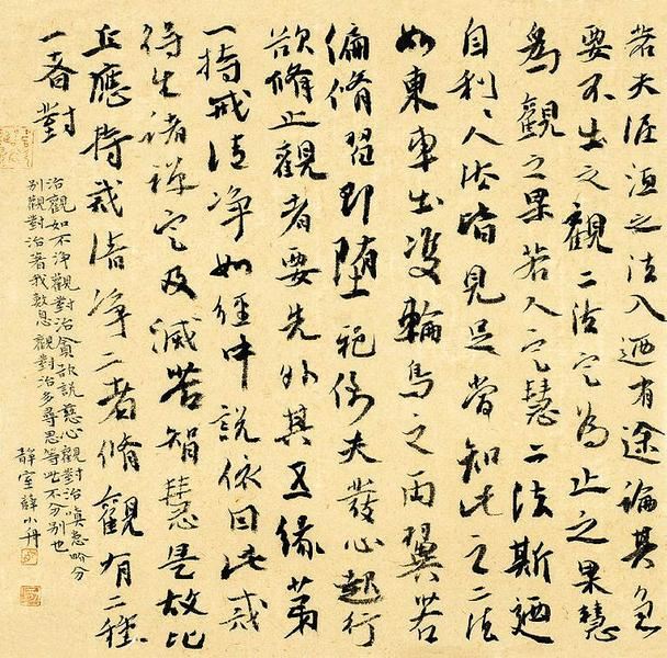 修习止观坐禅法要 60cm×60cm 分析了《十三行》具体的点画规律和特征,我们在临习时对工具材料的选择上要讲究些。古人讲,工先欲其事,必先利其器。毛笔要选用弹性较好的狼毫或兼毫,纸张选用半生半熟的宣纸或毛边纸、元熟纸。宜细不宜粗,宜滑不宜涩,墨选用红星、玄宗、中华等上好的油烟墨或纯墨锭均可。临习时执笔在指、运笔在腕,多用腕力少用指力。兼收并蓄,如对钟王先有涉足,再入此帖,相辅相成,勤于练笔,方有挥运之成。 综上所述,笔者结合自己对这两本经典法帖的学习,认为在今天小楷失去实用环境下,如何继承小楷艺术,我们应立足传统、放眼历史、植根经典、紧随时代,不断追求小楷的艺术性。比如形制上可用手卷、册页、扇面、花笺等展示,书写的内容可以是书信、日记、散文、自由诗等,增加小楷的包容性和可塑性,丰富它的表达方式和内涵,追求小楷特有的韵致、温雅、飘逸、清净、安然的审美观念。师古、化古,更加融入古人那种生活化的书写,让我们的状态与感觉离古人走得近些、再近些。 薛小舟简介: