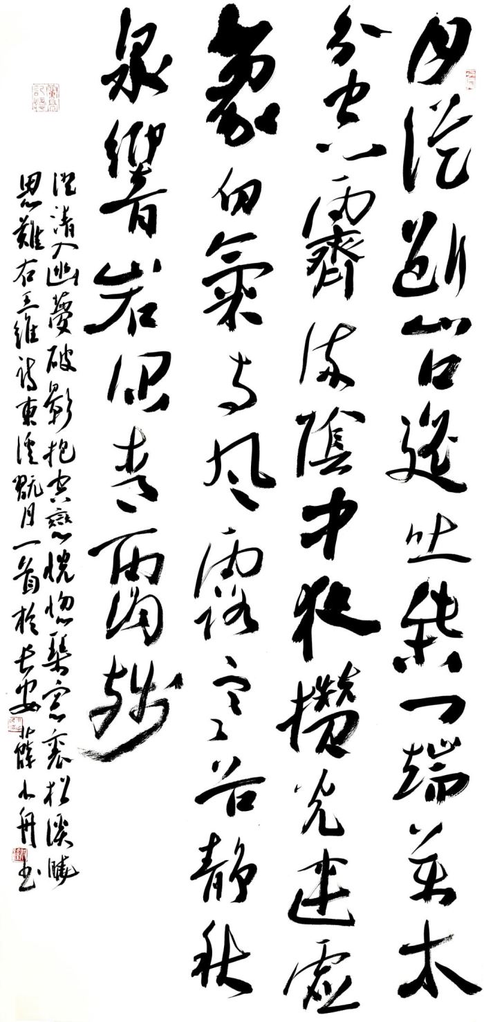 王维诗 138cm×70cm 《十三行》最突出的用笔特点是外拓,挥运中敛放自如,使得点画遒劲健朗、奕奕动人。故康南海曾说:“提笔中含、顿笔外拓、中含浑劲、外拓雄强”。从这点上他区别于钟、王书那种凝重、厚实、朴茂的情态,给人清爽劲健、优雅秀逸的美感。从线质上《十三行》比钟、王显得流美妍丽,其线条纤细均匀,但却蕴含着极强的力量感。在临习过程中应注意:1援横画如“晋”“书”“翠”等长横字,行笔着力均匀,收中自然轻顿,并带有一定上弧顺锋入纸。2援竖画如“椒”“轻”“神”等长竖,起笔向右下轻顿后再向下行进,收笔或悬针或垂露,自如轻松。3援撇捺如“吟”“左”“长”等字,注意舒展洒脱、优雅秀丽。4援折如“静”“南”“湍”等字避免生硬、明显外拓。5援戈钩如“我”“诚”“飞”等字要笔力挺拔、戈钩峻健。在章法上《十三行》吸取钟、王横无列、纵有行的面目,且错落有致,字形上大小不一,字距不等,然行气贯通、避让有序、松紧自如、顾盼生姿。也因此使得此帖风姿绰约、仪态生动,确有一种风神飘逸、姿致萧朗的韵致之美。