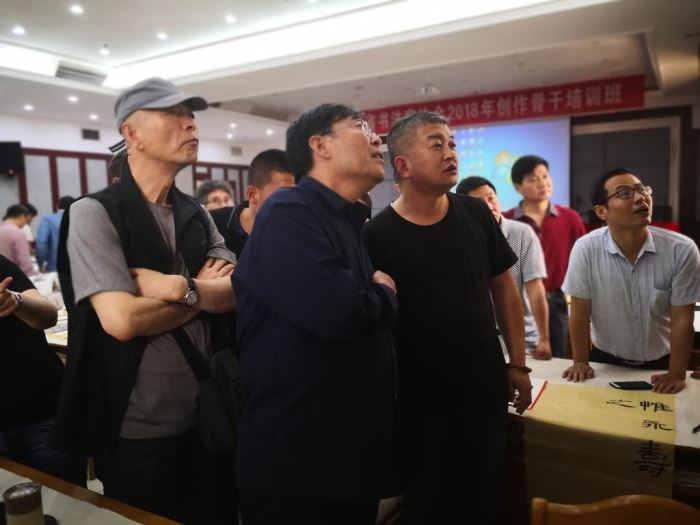 书法创作骨干培训班授课现场,学员学习热情高涨 当天下午,仇高驰老师现场指导学员,并亲自示范书写“不忘初心”的作品,刘鹏等人也在现场挥毫泼墨,气氛非常热烈,赢得了学员们不断的喝彩掌声。这种理论与实践相结合的培训方式,十分有效地为学员打开了创作的独特思维。 随后吴振锋、唐永平、王学岭等老师分别走进课堂为学员们讲解,授课持续到5月26日下午结束。
