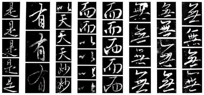 四 我们真的应该敬畏怀仁。他历二十四年,呕心沥血,焚膏继晷,以其对书学的深厚造诣和严谨态度,集成《千王碑》(《圣教序》又称《千王碑》)。《圣教序》形神兼备,秀劲超群,分行布白,笔意俱存,俨然一气呵成,点画位置天然,章法秩理,韵味平和简静。诚可谓“羲之真迹,咸萃其中”。 (一)拟古出新,锋芒毕现 王羲之初学卫夫人,转效钟繇,得书法古雅质朴之法。后其增损古法,汲古变今,形成笔法精致、雅量清健、隽永超然之书法面目。王羲之的书风也经历了由古到今的蜕变。就现存的传为王羲之的墨迹来看,《寒切帖》《姨母帖》等似有王羲之“古体”朴茂遗风;冯摹《兰亭序》《丧乱帖》《二谢帖》《初月帖》为“今体”流美风格典型。学习王书应该将其“古体”与“今体”结合起来学习,但就如何学习《圣教序》来说,似乎应当较多关照“今体”。 王氏“古体”,承汉魏古朴用笔,寓篆隶笔法;王氏“今体”,拟古出新,抒情散怀,流美雅逸,锋芒毕现。《圣教序》尽管直取内府羲之真迹,毕竟有刻石特性,书风介于羲之“古体”与“今体”之间,我以为在学习此帖时应尽现锋颖,靠近《兰亭序》一些,做到“拟古出新,锋芒毕现”。我说的“出新”不是“出己新意”,而是写出王羲之的“今体”面貌。如能将《圣教序》写成王羲之“今体”,对寻得王氏真经或为有效的门径之一。 (二)同寓不同,微妙精察 《圣教序》中相同的字并不因为是集字就缺少变化,颇显刻板,恰恰正是不同寓于相同之中。若非精研细察,难窥其微妙变化。由于刻石的特殊性,即使是同一个字模,也会有不同之处,这些细微的变化,怕不是古人为了让后学得到磨炼而设的坎儿?抑或是“无心插柳”?经典的魔力恰恰正在于此。“察之者尚精,拟之者贵似”,失之毫厘,谬之千里。