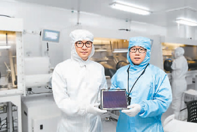姚冀众(左)与团队成员展示钙钛矿光伏组件
