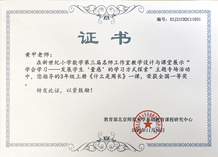 文化艺术网-文化艺术报讯 (全媒体记者 何超锋)近日,由教育部北京师范大学基础教育课程研究中心主办,为期三个月的“新世纪小学数学第三届名师工作室教学设计与课堂展示活动”落下帷幕。由西安市曲江第一小学副校长、西安市黄甲名师+研修共同体主持人黄甲和工作室成员龙博望、张阿娟、杨红一起组成的参赛团队从全国近百个团队中脱颖而出,喜获团体一等奖。