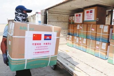 2020年3月23日,在柬埔寨首都金边,机场工作人员搬运中国援柬医疗物资。新华社发