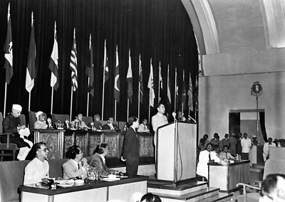 1955年4月,周恩来在万隆会议上发言。新华社发