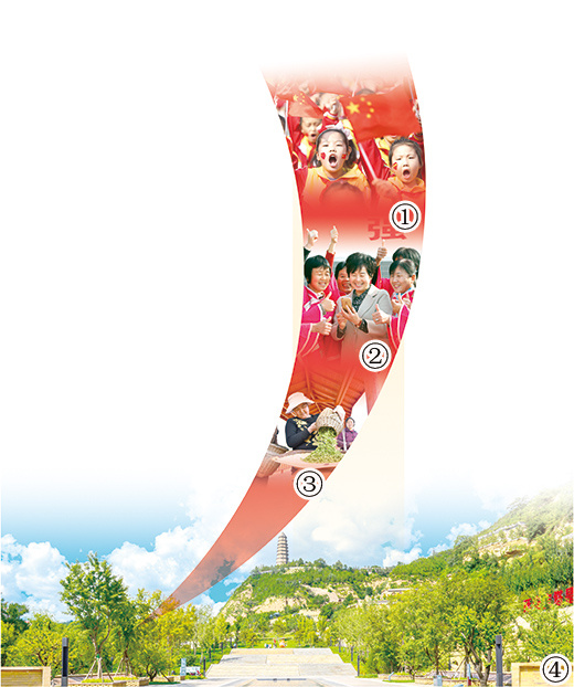图①:2019年9月,渭南市临渭区五里铺小学开展主题教育活动。崔正博 摄 图②:全国人大代表、合阳县黑池镇五丰社区党总支书记雷温芳通过手机向群众介绍惠民新政策。崔正博 摄 图③:汉中市南郑区茶叶产业园内,村民们正在工作。冯雪峰 摄 图④:延安宝塔山景区。刘阳 摄