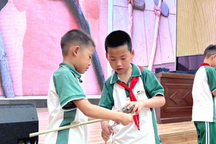 溯文明之源:对话“大荔人”与家乡根脉 渭南市博物馆讲解员从一片二十万年前的渭南土地启程,从古人类的生活智慧,仓颉造字的故事,到渭南及蒲城引以为傲的名人轶事、特色美食与名胜古迹,丰富内容点燃了孩子们对家乡的认知热情。随后的有奖问答环节,更是将现场气氛推向高潮。知识的热度未退,得奖的孩子还在仔细研究文创印章明信片,另一边的孩子们已迫不及待地化身“小原始人”,亲手选石料、拉麻绳、绑制属于自己的“石斧”。粗糙的触感与好奇心交织,史前生存的艰辛与智慧在指尖真切可感。