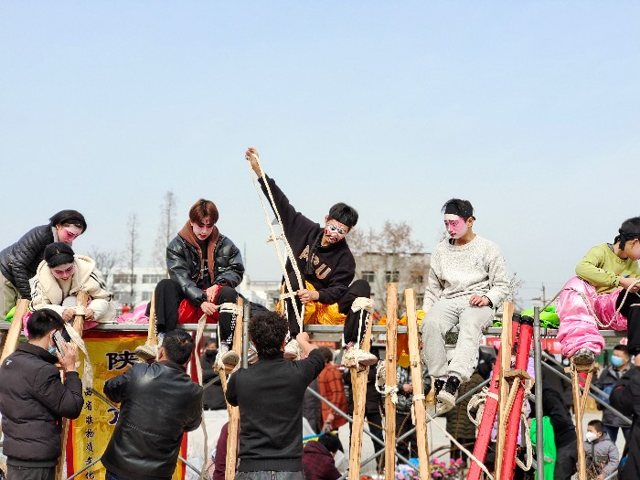 活动于下午2点正式开始。在东关里文化运动广场,伴随着一声响过一声、一声急过一声的锣鼓点,协税社火高跷扭起来了。演员们踩着两米多高的高跷如履平地,惊险、逗乐的场景惊艳全场,观众们纷纷拿出手机、相机留下饱含年味儿的影像。